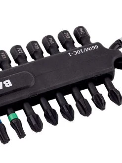 - Bit set of 10 bits for Phillips, Pozidriv and TORX® head screws