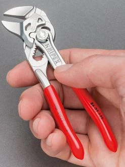 - The Knipex 86 03 Series Pliers Wrench with dipped PVC handles and smooth parallel jaws for cautious installation of plated fittings or sensitive surfaces.