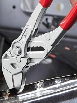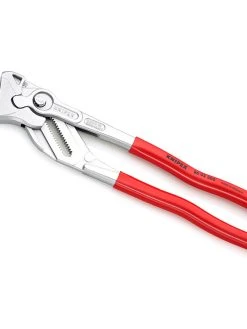 - The Knipex 86 03 Series Pliers Wrench with dipped PVC handles and smooth parallel jaws for cautious installation of plated fittings or sensitive surfaces.