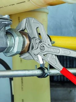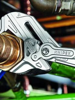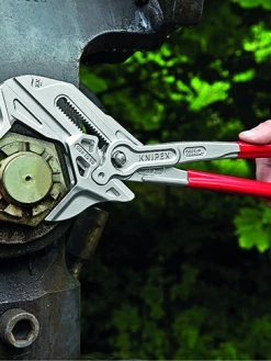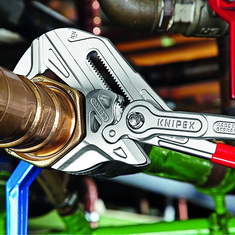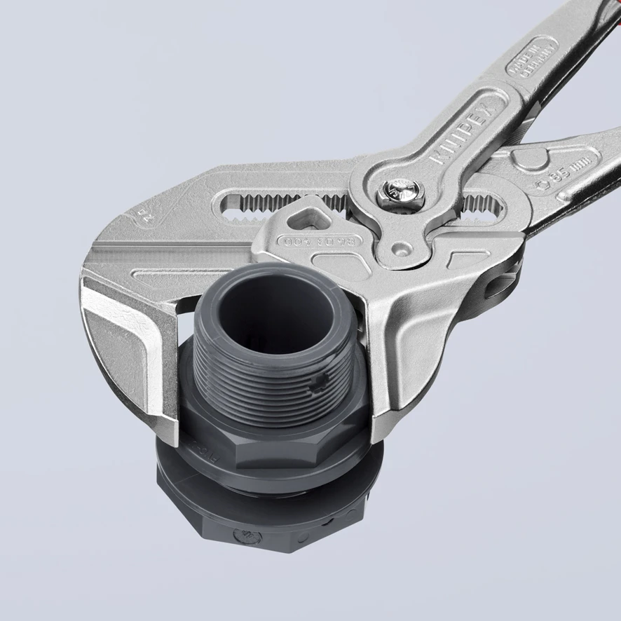 - The Knipex 86 03 Series Pliers Wrench with dipped PVC handles and smooth parallel jaws for cautious installation of plated fittings or sensitive surfaces.