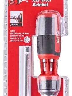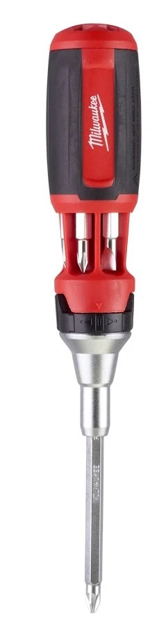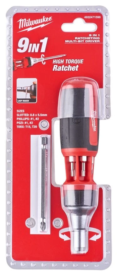 - The Milwaukee 9-In-1 Multi-Bit Screwdriver is a durable, all metal high torque ratchet for 2 x driving speed and control. Magnetic bit retention delivers consistent driving performance. It uses 88mm long power groove bits for power tool compatibility. The bits have precision hardened tips for a secure fit and are chrome plated for maximum durability. The driver uses a revolver style bit storage and selection, it also has a built-in loop maker.
