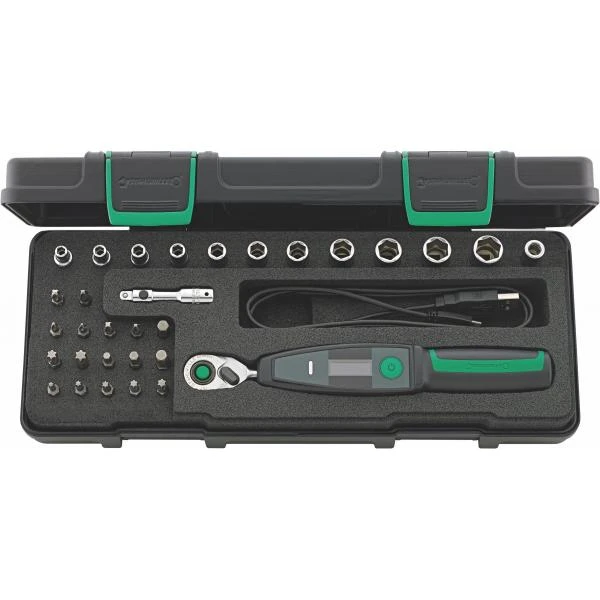 - Whenever absolutely precise screw tightening is required in the tightest of spaces and must be documented, the electronic torque wrench plays its strengths off. In addition to its particularly slim and compact design, it convinces with innovative and intuitive one-key control and a fixed fine-tooth ratchet with 80 teeth. The set is completed by the robust set box and extension, Sockets and bits.