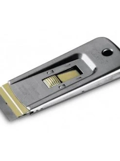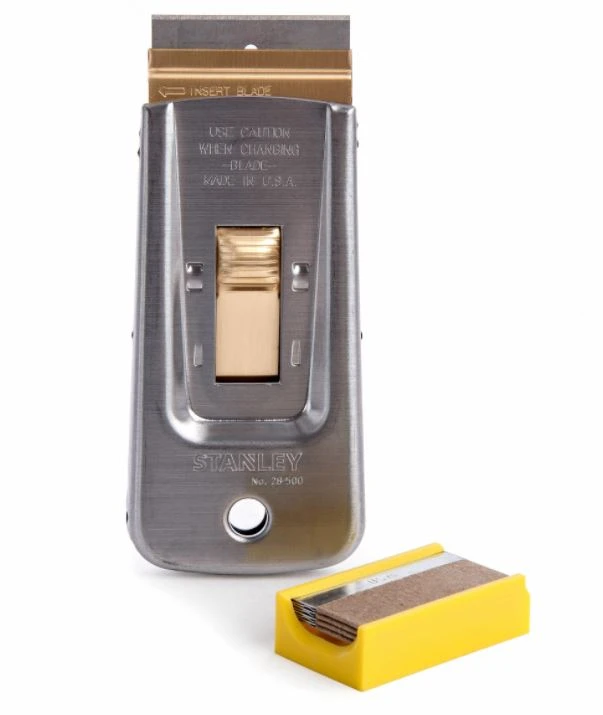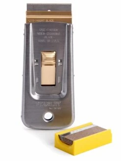 The Stanley 28-500 Razor Blade Scraper removes paint, glue, putty or adhesives from glass, tile, walls, floors or other smooth surfaces. Especially handy for cleaning excess paint from window glass after painting frames. Blade retracts for safe storage. Uses standard single-edge razor blades. Comes with 5 blades.