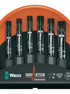 Impactor bits 50mm long 1/4 drive set of 6. The Impaktor technology ensures an above-average service life even under extreme conditions thanks to a best-possible utilisation of the material properties and optimally designed geometry, particularly suitable for use with conventional impact drivers. Holder equipped with a ring magnet to easily hold longer and heavier screws, also ideal for above-head work. The rough diamond coating of the bits reduces the danger of any slipping out of the screw head due to the enhanced frictional resistance.