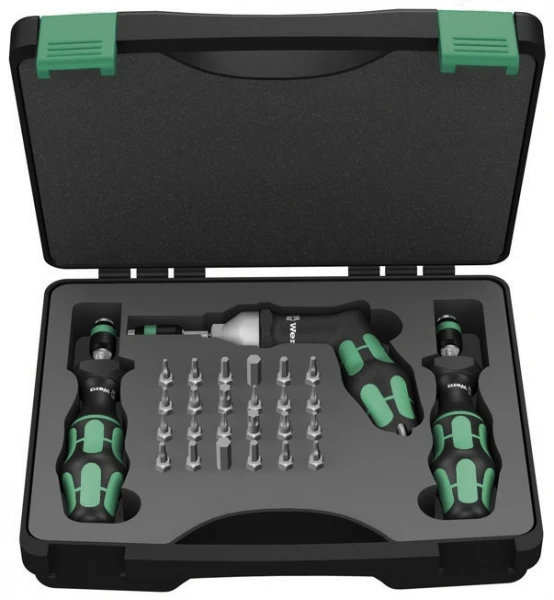 27 Piece Adjustable Torque Screwdriver set with patented Kraftform handle and Rapidaptor quick release 1/4″ bit holder. The torque setting is quick and easy to adjust. Pistol grip for easier and safer use at the higher torque levels. The bit holder is suitable for all standard 1/4″ screwdriver bits. Torque Range: 0.3 to 6.0 Newton Metres. This set comes in a quality storage case containing 3x Torque Screwdrivers and a range of high quality screwdriver bits. Measurment accuracy +/- 6% in accordnace with EN ISO 6789