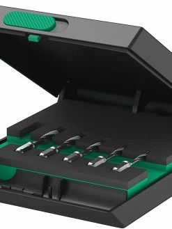 - Professional 7 piece combination tapping drill bit set by Wera in a padded stable plastic storage box.